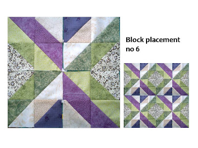 I used 3 purple, 3 green and 4 cream printed fabrics. But once I started playing around with the placement of the blocks I came up with so many different settings that now I am completely stuck, and I don't know what to do.